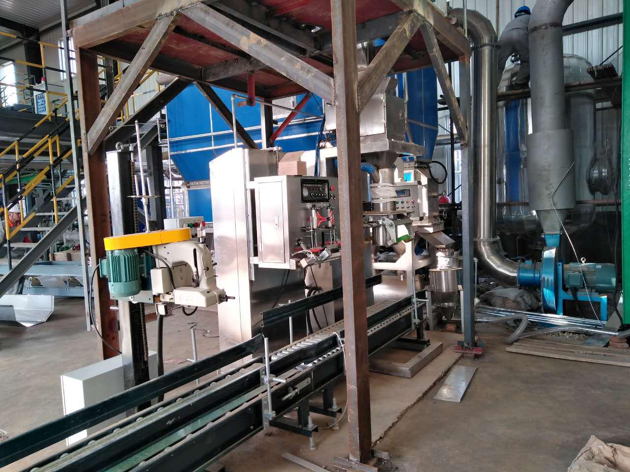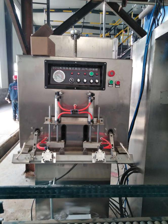 集料分配裝置接收干燥機(jī)組的出料,經(jīng)加速室由負(fù)壓氣力輸送系統(tǒng)輸送至緩存料倉(cāng),再通過分料器為包裝機(jī)供料,包裝機(jī)采用特殊夾袋機(jī)構(gòu),配合除塵系統(tǒng)避免揚(yáng)塵。抽真空熱合機(jī)和縫包機(jī)對(duì)滿袋物料進(jìn)行密封封口,配合變頻皮帶輸送機(jī)協(xié)同輸送包裝袋。此套儲(chǔ)運(yùn)、包裝系統(tǒng)在滿足用戶生產(chǎn)需要,提供自動(dòng)化的同時(shí),又大大改善了操作環(huán)境。受到客戶的高度贊揚(yáng)。